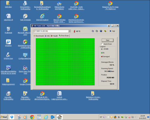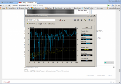 Hoi, Mako Here are the results, of the ...... Vandaag na de schijfcontrole en de benchmark plus toch maar eens google chrome eraf en opnieuw opgezet , gaat eindelijk een stuk sneller. Logboek, schoon. Ook de IE browser waar mijn man zijn outlookmail op staat, doet het goed, kan het nog niet helemaal geloven . Ik hoop dat nu nu echt blijvend is, maar ik wacht natuurlijk jouw oordeel af. 2 benchmark logs meegestuurd, een van na schijfcontrole 8-6-15 en een van 10-6-15 met vernieuwde google chrome erop. Hij is nog wel rumoerig, gek is ook dat de letter l van teksten in en van de mappen wat oranje gekleurd zijn, maar dit slaat wellicht nergens op, denk vertel het toch maar, je weet maar nooit? vriendelijke groet Ellen