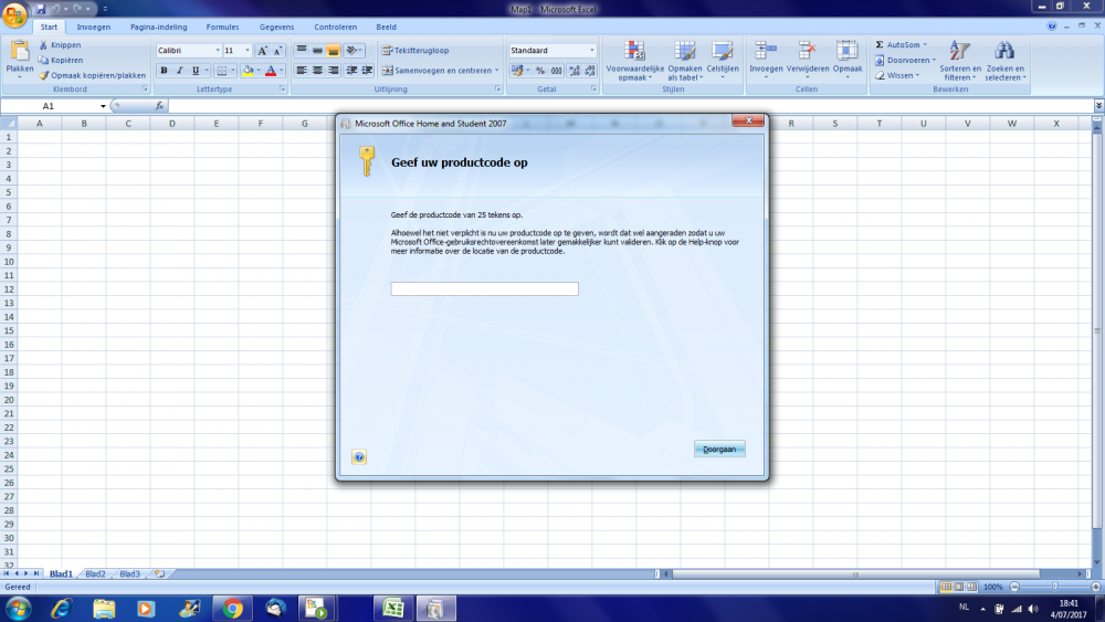 Dat gaat niet, office is al geistalleerd. Ik heb op het bureaublad wel een icoontje: zie bijlage 1 als ik daarop klik, verschijnt bijlage2. als ik excel wil openen, krijg ik bijlage 3. Daar worden mijn codes niet aanvaard. -