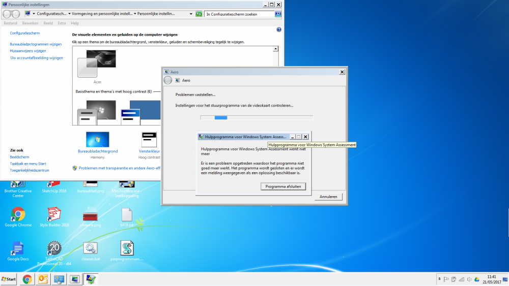 Ik kan bureaubladthema's niet meer aanpassen. enkel nog windows klassiek Op bureablad, rechtsklik en kies "aan persoonlijke voorkeur aanpassen" Dan kom je op een blad waar je thema's kan kiezen. Daar kan ik enkel nog windows klassiek en oudere thema's kiezen, de andere (windows7 en aero-themas) staan er nog maar in grijswaarden en kan ik niet meer selecteren. Als ik onderaan op problemen oplossen klik krijg ik volgend bericht. Zie bijlage. Verder worden snelkoppelingen die vastgemaakt zijn aan de taakbalk niet meer getoont( enkel als ze actief zijn) En ook kan ik de pictogrammen op het bureaublad niet meer schikken zoals ik wil, bij iedere opstart staan ze terug waar de pc het wil. Iemand enig idee wat er aan de hand is?