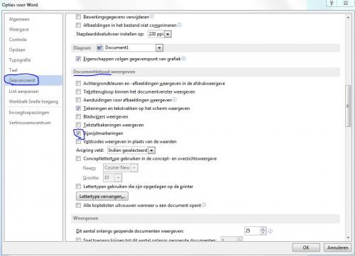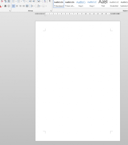 2. Clarkie Bedankt voor je antwoord , het lag dus aan de bijsnijdmarkeringen. Deze zet je af door in Word 2013 via bestand -> opties -> geavanceerd -> documentinhoud -> bijsnijdmarkeringen af te vinken (zie foto).