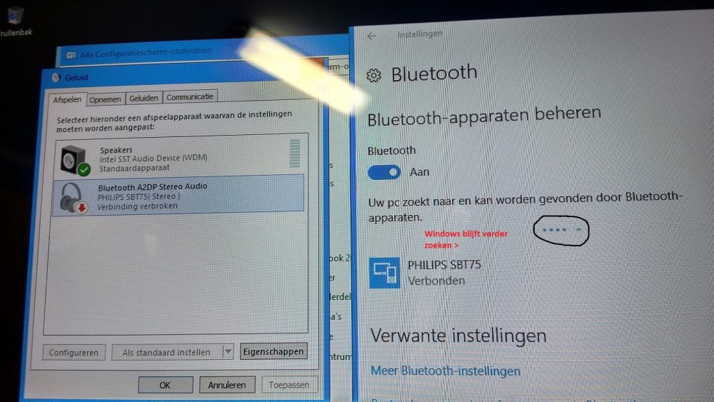 Dag,ik heb een tablet/pc (AXXO WT-1122) : http://mmtc-benelux.com/producten/wt-1122-2-1-tablet-11-6-inch/Ben daar uiterst tevreden over , ik zit echter met een (klein) probleempje , mijn bluetooth speaker Philips SBT75 wordt wel gevonden in Windows 10 maar de speaker vind blijkbaar Windows niet.normaal moet ik eerst de speaker aanleggen en dan begint een blauw lichtje te knipperen tot er verbinding is , het knipperen gaat dan over naar een constant brandend blauw lichtje en hoor ik een biep zodat ik weet dat de speaker verbonden is .dit werkt perfect met mijn smartphone...als ik de AXXO via de bluetooth instellingen van Windows 10 laat zoeken naar mijn speaker (Philips SBT75) dan wordt deze gevonden en wordt er verbinding gemaakt , echter blijft op de speaker het blauwe lichtje knipperen , en geen biep , terwijl in Windows 10 het zoeken ook verder gaat...als ik via instellingen naar "geluid" ga dan staat de speaker erbij maar daar staat de status op verbinding verbroken....iemand ènig idee hoe ik dit kan oplossen ? ik kan de speaker wèl verbinden via een audio kabeltje !.Mvg,Arnold.