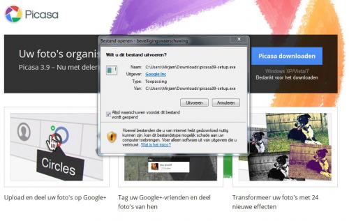 2. Bij het updaten naar picasa 3 ging er telkens iets mis, ik moest nadat Picasa afsloot, telkens de versie 3 updaten. Dus besloot ik alles te verwijderen (via configuratiescherm - programma verwijderen, dan krijg je ook de optie je picasa-album te bewaren, voor het geval je opnieuw wilt downloaden) en het dus inderdaad opnieuw te downloaden. Maar helaas gaat het daar mis. Ik kan de setup downloaden, die komt in mijn downloads te staan. Wanneer ik daarop dubbel klik, kan ik uitvoeren aanklikken, maar dan gebeurt er niets, er wordt niets nieuws geopend, niets. Iemand enig idee waar dit aan kan liggen? Alvast bedankt voor de hulp.