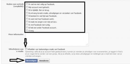 5. Bedoel je je account op Facebook? Log in op je Facebook account-selecteer in je taakbalk het pijltje naast startpagina en vervolgens account instellingen. Op de pagina die nu opent selecteer je Beveiliging en daarna Je Account deactiveren. Er opent een nieuw venster en daar geef je dan een reden op en zet je een vinkje bij Geen email notificaties meer ontvangen en dan bevestig je je keuze. Nu is je account verwijderd.;-)