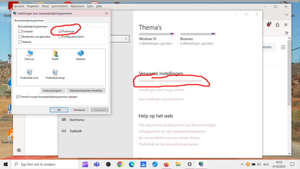 De prullenbak op bureaublad van mijn computer is plots verdwenen. Nergens meer te vinden. Heb wat gegoogeld, en werd verwezen naar de instellingen. Daar staat prullenbal met een vinkje. Nogmaals op toepassen klikken helpt niet. Computer herstarten helpt ook niet. Als ik een document uit verkenner verwijder, en ik zoek dan op naam van dat document, dan vindt verkenner niets. Wat nu? Dank bij voorbaat hoor hulp.