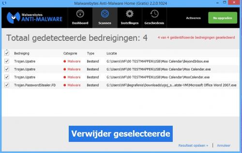 Dag kweezie wabbit, hierbij de gevraagde link: http://speccy.piriform.com/results/QfzN5FkU72zJMpX18WV8Cxi De bovenstaande 5 besmettingen lijken mij ook eerder ongevaarlijk. Vermits elke poging om virussen aan te vallen gecounterd werden, heb ik de harde schijf uit de pc gehaald en met een voeding en een zelf ineen geknutseld apparaatje deze schijf via usb aan mijn virtuele laptop gehangen. Deze werd gezien als een externe harde schijf, en op die manier kon ik MalwareBytes wel laten scannen. En daar werden trojans gevonden en verwijderd. In bijlage een snapshot ervan. Wat ik vreemd vind is dat het programma zoek.exe zich nog steeds niet laat installeren. Er wordt toestemming gevraagd om te installeren, maar uiteindelijk wordt er niets geïnstalleerd. Mvg. Impala.
