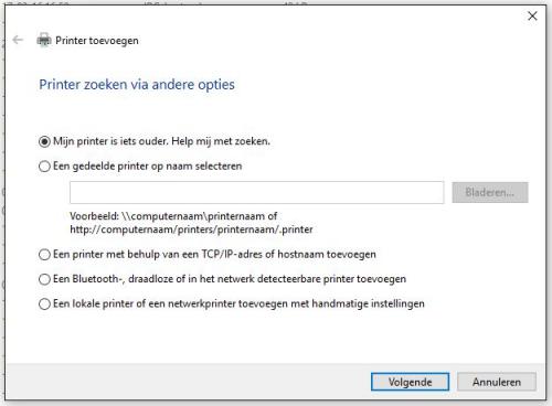 25. Hallo, Ja, ik gebruik de printer enkel op één computer via USB. Ik heb de printer opnieuw gedeïnstalleerd en de hele procedure doorlopen om hem in de 'traditionele modus' te installeren. Bij de installatie kom ik terecht op het onderstaande schermpje: Als ik hier kies voor 'Mijn printer is iets ouder...', weet ik daarna niet hoe het verder moet. Als ik kies voor 'Een lokale printer toevoegen met handmatige instellingen', geraak ik wel doorheen een procedure. In die procedure moet ik op een bepaald moment voor de printerpoort kiezen; ik neem hier dan wel USB (en niet LPT1). Als ik na de installatie van de driver de printer inschakel, wordt hij herkend en geïnstalleerd (er wordt zelfs vermeld dat 'HP LaserJet 2055d' wordt geïnstalleerd - inderdaad mijn model van printer). Maar daarna loopt het weer fout. Als ik iets probeer te printen, gaat er de eerste keer gewoon een blad doorheen de printer (maar er is niets afgedrukt). De tweede keer krijg ik weer de fout 49 Err 3D90A44. Maar de installatie lukt dus wel 'beter', in die zin dat ik niet meer dat blokkerende scherm 'Selecteer de HP-printer die u wenst te gebruiken' krijg. Groeten, jd027