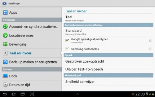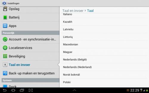 Ik ben zelf eens gaan kijken op mijn eigen tablet (wel een Samsung, maar ook met 4.0.4) hoe de instellingen er juist uitzien (maar dat kan natuurlijk verschillen aangezien het een ander merk is). Als je bovenaan op Taal tikt (waar bij mij in afbeelding 1 hieronder dus Nederlands (België)) staat, krijg je dan niet (zoals in afbeelding 2 hieronder) het scherm waaruit je de taal kan selecteren, of staat daar alleen maar Nederlands (Nederland)? Staat het Bluetooth-toetsenbord daar ergens vermeld bij Toetsenborden en invoermethoden? Of welke toetsenborden staan er vermeld, en zijn er vinkjes die je eventueel zou kunnen afvinken?- 5 antwoorden