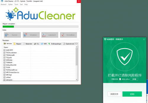 Ik kan adw cleaner wel scannen maar zodra ik op verwijderen klik, reageert het programma niet meer , rechts onderin het scherm komt die chinees weer tevoorschijn(zie bijlage) en Nu??? -