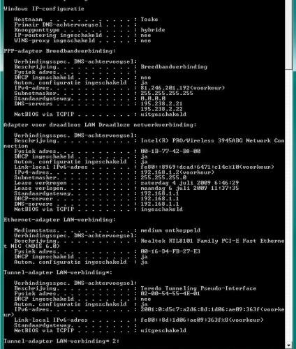 Ja, maar bij de ene pc (want ik heb 2 nieuwe) gaat het , en bij de andere niet, sorry voor de verwarring :s Ik ben zelf in de war.. Dus, degene vanwaar ik dat zwarte scherm heb doorgestuurd werkt. Nu nog gewoon de andere(ook XP) -_-" Het mac adres staat er zo bij: DHCP Client Lan DHCP clients currently linked to the router: mac =00-1B-77-42-BA-00 Zoals het moet dus? En dan als ik uitvoeren>cmd>ipconfig doe : Primair DNS-achtervoegsel: Knooppunttype: onbekend IP-routering ingeschakeld:nee WINS-proxy ingeschakeld:nee DNS achtervoegsel: Beschrijving: Fysiek adres: 00-23-4E-40-83-9E DHCP ingeschakeld:nee IP-adres:192.168.1.3 Subnetmasker:255.255.255.0 Standaardgateway:192.168.1.1 Ethernet/LAN Status van medium: medium ontkoppeld Beschrijving: Fysiek adres:00-23-8B-13-DB-41 Al heel erg bedankt voor je hulp. -