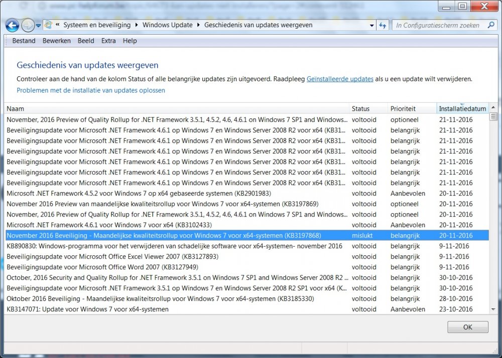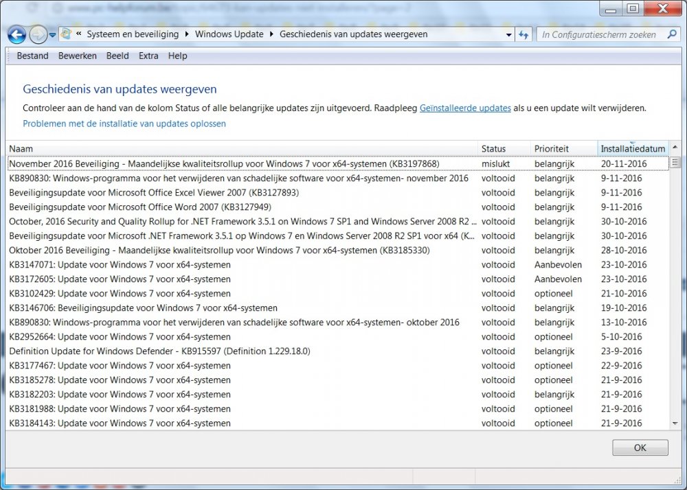 er was een zwart scherm met alleen de muis werkend en zichtbaar maar de toetscombinatie werkte niet, vandaar de powerknop de volgende update staat in geinstalleerde updates maar is mislukt zoals u ziet November 2016 Beveiliging - Maandelijkse kwaliteitsrollup voor Windows 7 voor x64-systemen (KB3197868) Installatiedatum: 20-11-2016 10:24 Installatiestatus: mislukt Foutdetails: Code 80004005 Type update: belangrijk Er is een beveiligingsprobleem vastgesteld bij een softwareproduct van Microsoft dat invloed kan hebben op uw systeem. Installeer deze update van Microsoft om uw systeem hiertegen te beveiligen. Zie voor een complete lijst met problemen die in deze update zijn opgenomen het bijbehorende Microsoft Knowledge Base-artikel. Nadat u deze update hebt geïnstalleerd, moet u de computer wellicht opnieuw opstarten. Meer informatie: http://support.microsoft.com/kb/3197868 Help en ondersteuning: http://support.microsoft.com die kan ik dus niet meer opnieuw installeren?