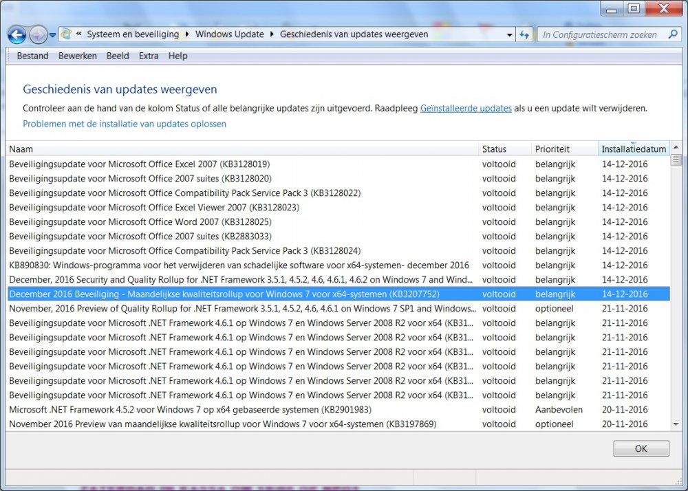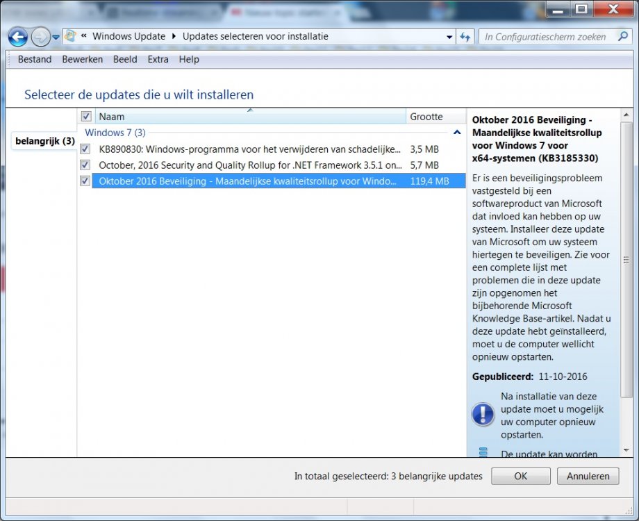 kreeg deze melding na op de update te hebben geklikt, sorry, de eerste afbeelding is niet de juiste maar ik weet niet hoe te verwijderen de kleine daaronder is de juiste ik neem aan dat ik die niet meer hoef te doen nu kreeg vandaag nog wel deze update binnen, November, 2016 Preview of Quality Rollup for .NET Framework 3.5.1, 4.5.2, 4.6, 4.6.1 on Windows 7 SP1 and Windows Server 2008 R2 SP1 for x64 (KB3196686) Downloadgrootte: 60,9 MB U moet de computer mogelijk opnieuw opstarten om deze update van kracht te laten worden. Type update: optioneel Install this update to resolve issues in Windows. For a complete listing of the issues that are included in this update, see the associated Microsoft Knowledge Base article for more information. After you install this item, you may have to restart your computer. Meer informatie: http://support.microsoft.com/kb/3196686 Help en ondersteuning: http://support.microsoft.com