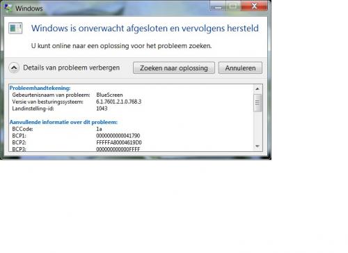 dat bluescreen is het enigste probleem nog de processor is prima met temp. en gebruik voor ik hem wegbreng voor herinst. van Win7 heb ik een geheugencontrole gedaan en de uitkomst is deze: (zie bijlagen) kan 1 van de geheugenbankjes kaduuk zijn?