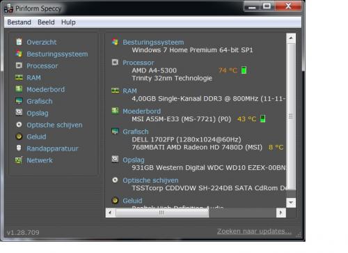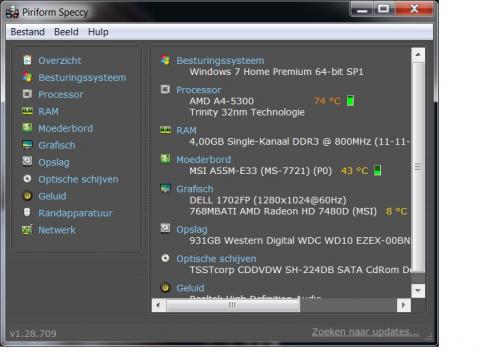 de PC staat al een half uur open op een stuk hardboard en er veranderd niets o ja, natuurlijk staat outlook ook aan en als ik dit heb ingetypt en terugkeer naar Speccy keert die van 79 terug naar 74 graden