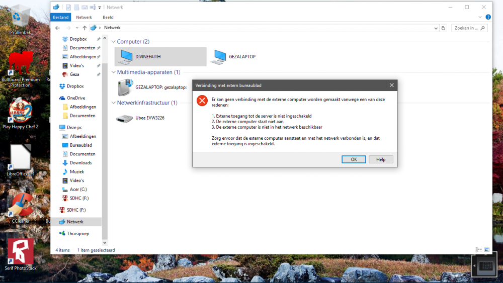 1. Het uitschakelen van BG gaat zeer snel dus kan ik geen bewijs tonen.Beide eerst uitgeschakeld en opnieuw gestart met de thuisgroep. Bijgaand een bewijs van een verbinding-weigering met op de achtergrond links de BG icoon.(laptop) Er kan geen thuisgroep worden ingesteld op deze PC (desktop) beide PC's Sorry, maar ik geloof dat het beter is om met dit probleem te stoppen. Nogmaals bedankt voor de medewerking. gr.v.Gees