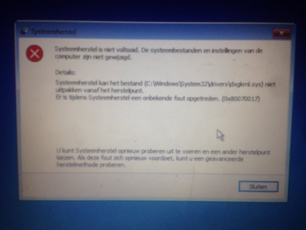 Hey, Systeem herstel naar vorig herstelpunt is ook niet gelukt. Hij gaf een foutcode aan en het volgende "Systeemherstel kan het bestand (C:/Windows/System32/drivers/dxgkrnl.sys niet uitpakken vanaf het herstelpunt" Misschien wat andere oplossingen? mvg. Wesley -