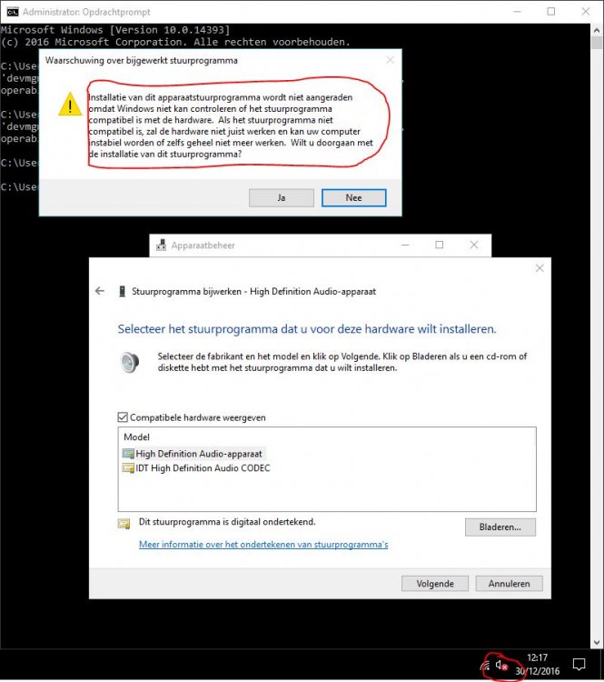 8. Aangezien ik geen geluid heb is dit de oplossing, dat installeert IDT weer, maar dan krijg ik deze melding, is dit de oorzaak van het flikkerend scherm?