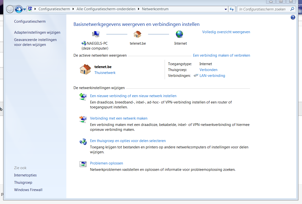 Bij het opstarten van de pc werd mij de vraag gesteld van Avast antivirus of telenet.be een openbaar netwerk was. Heb wat te lang gewacht voor ik het zag (was nog met andere zaken bezig) en op de vraag een antwoord geven ging niet meer, er gebeurde dus niets meer bij het klikken op dat berichtvakje. Heb dan naar het netwerkcentrum gaan kijken, en dat was het resultaat: Verder voeg ik er nog aan toe dat voordien mijn netwerk niet als thuisnetwerk maar als openbaar netwerk stond ingesteld. Dit was zo gedaan door de instalateur van de router/wifi. Waarom is mij een raadsel. win. 7 sp1 router Genius esr350