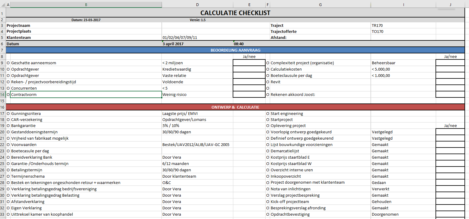 Beste Excel kenners, Ik heb een probleem! Graag wil ik ervoor zorgen dat wanneer 1 van de onderste velden(zie bijlage) niet is ingevuld met ja of nee, maar de bovenste velden wél allemaal op ja staan, er voor het opslaan een melding komt dat niet alle velden zijn ingevuld. Wanneer ik nu één van de velden waar 'ja' staat leeg laat, krijg ik al een melding dat er een veld is vergeten, dit is goed, dit moet zo blijven. Echter in fase 2 wil ik dat er wanneer deel 1 is ingevuld, maar deel 2 niet volledig, er ook een melding komt. Dit zal vast mogelijk zijn, maar ik kom er niet helemaal uit. Ik hoor het graag! Groet