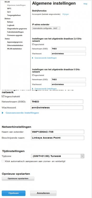 Dit is wat moet gedaan worden volgens Linksys, zou moeten vanzelf gaan. Dat gaat vanzelf, maar het werkt niet. NEDERLANDS SNELSTARTGIDS 1 Bereid u voor op de installatie. Controleer of de internetverbinding van uw router werkt en of u een Ethernet-kabel heeft die lang genoeg is om de router aan te sluiten op het draadloze accesspoint. 2 Sluit het draad loze accesspoint aan opeen wandstopcontact. 3 Wacht tot het knipperende statuslampje van groen in oranje verandert. 4 Sluit u w router met de Ethernet-kabel aan op het draadloze accesspoint. Het statuslampje zal groen blijven branden wanneer het draadloze accesspoint een IP-adres van de router heeft gekregen en klaar is voor het voltooien van de installatie. 5 Maak verbinding met het accesspoint-installatienetwerk. Maak op een computer, telefoon of tablet verbinding met het Wi-Fi-netwerk 'Linksys AP Setup - XXX', waarbij XXX staat voor de laatste drie cijfers van het MAC-adres van uw draadloze accesspoint. 6 Start de installatie. • Ga in een browser naar http://ap.linksys.com. Volg de instructies op het scherm orn de installatie te voltooien. De installatie omvat: • Het accepteren van de voorwaarden van de Licentieovereenkomst voor de eindgebruiker. • Het instellen van een beheerderswachtwoord voor het wijzigen van instellingen na de installatie. • Het creëren van netwerknamen en wachtwoorden voor de nieuwe netwerken (2,4 GHz en 5 GHz). Namenen wachtwoorden van de accesspoint net werken Noteer de namen en wachtwoorden van uw uitgebreide netwerk op de daarvoor bestemde plek. Beheerderswachtwoord voor het accesspoint Noteer uw beheerderswachtwoord. Dit heeft u nodig als u toegang wilt tot de instellingen van uw accesspoint. Ondersteuning nodig? Internet: linksys.com/support/WAP750AC of linksys.com/support/WAP1200AC; Twitter: @LinksysCares Misschien dat beheerswachtwoord? Daar gaf ik, op raad van VDHEE admin in.