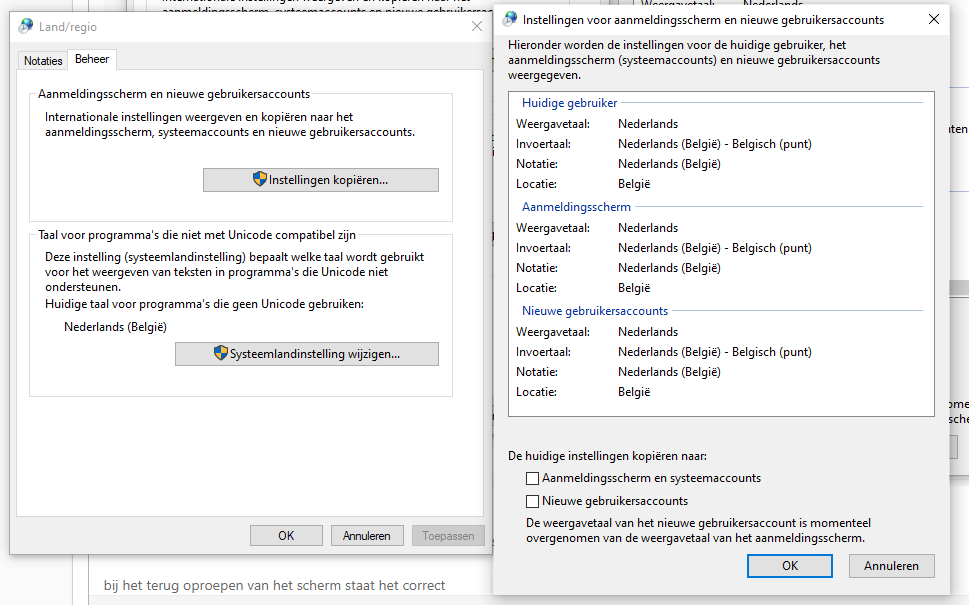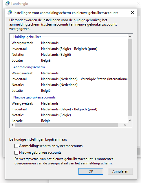 Beste, Bij het aanmeldscherm krijg ik steeds een qwerty toetsenbord. dit niettegenstaande ik via het configuratiescherm / land-regio - tabblad beheer - instellingen kopieren al enkele malen het vinkje "de huidige instellingen kopieren naar aanmeldingsscherm en systeemaccounts aangevinkt + OK geklikt als ik dan nogmaals in instellingen kopieren test staat alles correct; doch bij het heropstarten staat terug die duivelse qwerty indeling als standaard. hoe kom ik hier vanaf?