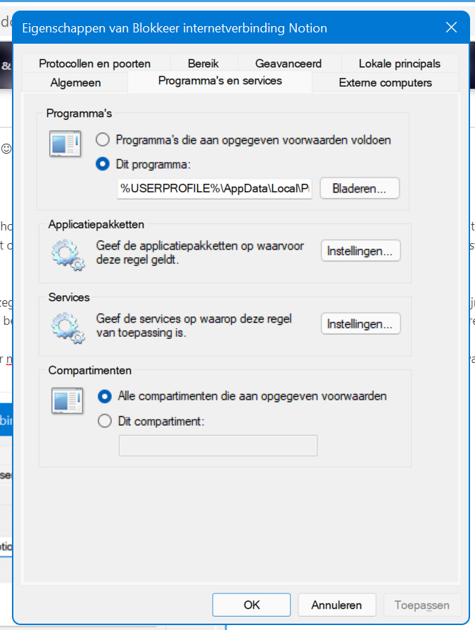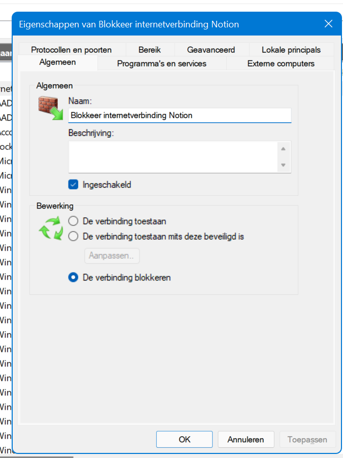 Hoi, Morgen hebben we examen Data Science op school, waarbij we een actieve internetverbinding moeten hebben om een online examen in te vullen, maar voor de rest mag er geen enkele verbinding actief zijn met internet, enkel die website.. Dit wordt in het oog gehouden met een programma waarvan we op het einde van het examen een logbestand moeten uploaden.. Andere verbinding dan die website = fraude = 0 Nu; het is wel een open boek examen, dat wilt zeggen dat we alles dat lokaal op onze laptop staat mogen gebruiken.. Ik zou dus graag mijn notities in Notion & OneNote willen gebruiken. Dit mag, maar ik ben bang dat als ik perongeluk iets bewerk, dat beide tools dan connectie gaan maken met het internet om deze wijziging te synchroniseren, en dan ben ik dus gebuisd.. Ik heb daarnet via de firewall een blokkade voor notion toegevoegd, maar als ik er iets in typ dan updated het nog steeds op de website van notion.. Waarde van "dit programma": C:\Users\jonas\AppData\Local\Programs\Notion Hoe zou ik OneNote & Notion kunnen blokkeren van internettoegang?