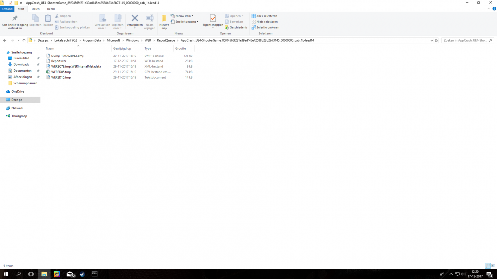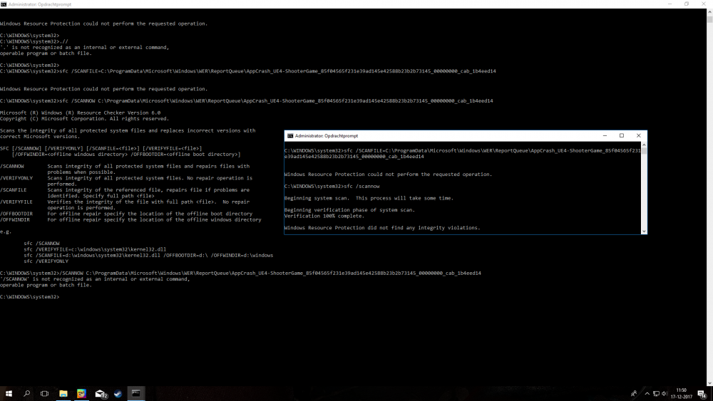 sfc /scannow C:\ProgramData\Microsoft\Windows\WER\ReportQueue\AppCrash_UE4-ShooterGame_85f04565f231e39ad145e42588b23b2b73145_00000000_cab_1b4eed1 Gaf alleen een lijst met commands en sfc /scanfile=C:\ProgramData\Microsoft\Windows\WER\ReportQueue\AppCrash_UE4-ShooterGame_85f04565f231e39ad145e42588b23b2b73145_00000000_cab_1b4eed14 Gaf de volgende melding "Windows Resource Protection could not perform the requested operation." Verder nog de hele computer gescand met sfc /scannow maar geen problemen gevonden.