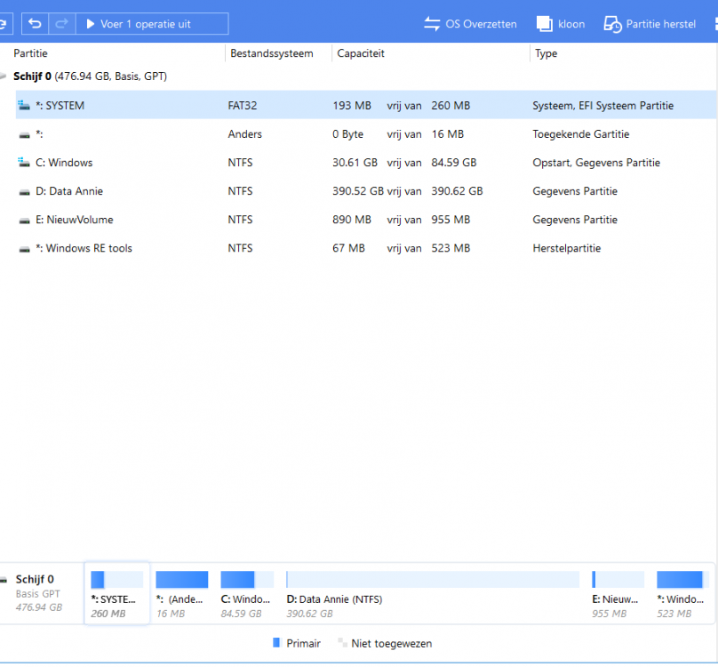 Ik heb van de E partitie (waar overigens ook nog niets op staat) het grootste gedeelte Ca. 27 GB afgehaald en naar C; verplaatst. Ik ben niet aan de systeempartitie geweest . Ik denk dat die er al door de fabrikant opgezet is.