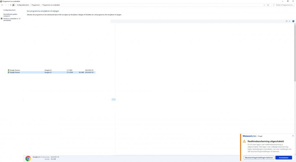 Heb Chrome op een USB stick gezet en opnieuw geinstalleerd. De oude versie blijft er echter als geinstalleerd staan en ik weet niet hoe die te verwijderen. Als ik Programma's en onderdelen verwijderen gebruik dan krijg ik diverse meldingen. zie screenshots. Geprobeerd een foto van een mail te downloaden via Chrome en Edge maar zonder resultaat. Melding: mislukt- downloadfout. Ook een update van Windows lukt niet.