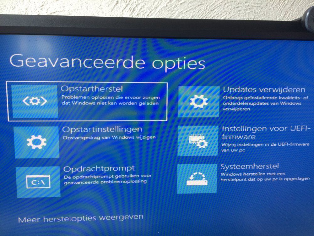 Ik vraag me even af welke optie ik moet kiezen. Ik vraag het maar even om mogelijk erger te vookomen. Na het opstarten krijg ik " auto herstel voorbereiden" te zien. Vervolgens in "gavanceerd" Doorgaan PC uitzetten en wat denk ik belangrijker is de mogelijkheid "Geavanceerde opties. Het scherm dat daarna verschijnt heb ik als bijlage bijgevoegd.