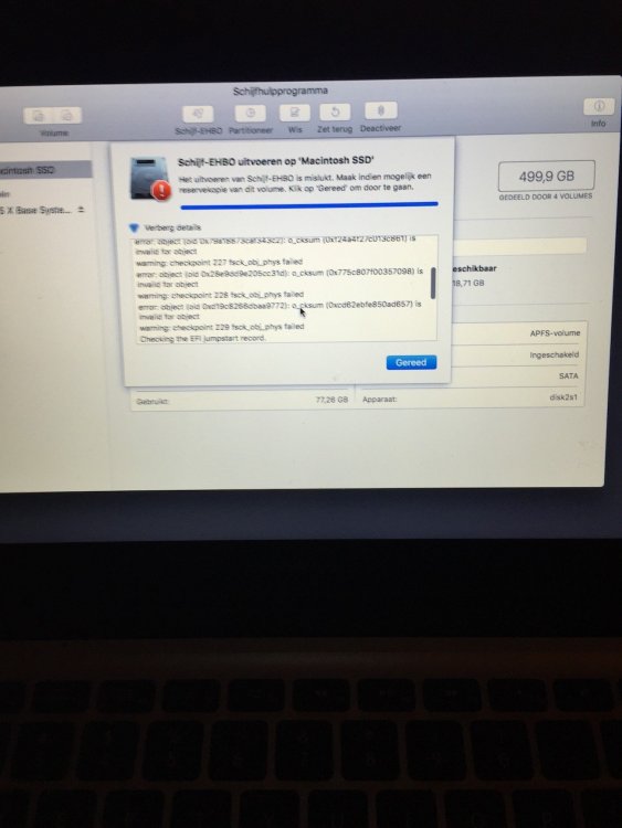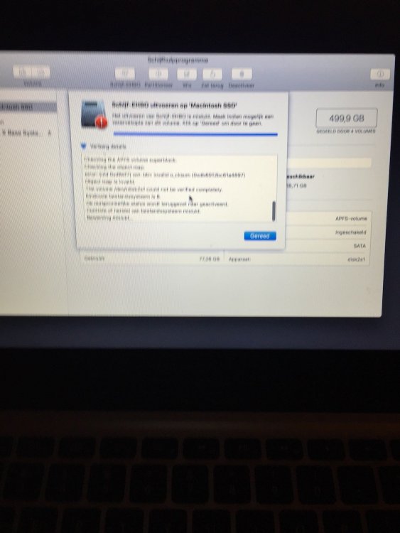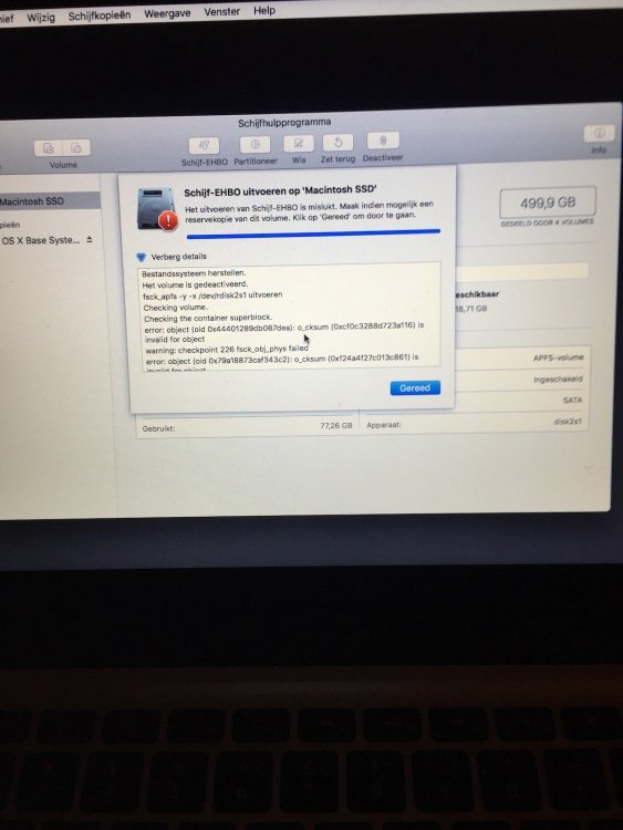 Beste helden, Sinds enige tijd heb ik de Crucial MX500 in mijn Macbook geplaatst. Na verloop van tijd begon de laptop vast te lopen. En sinds deze week heb ik als ik de macbook opstart een wit scherm met een cirkel en streep. Als ik wil checken wat er mis is met mijn harde schijf krijg ik de foutmeldingen die je in de afbeeldingen kan zien... Wie kan mij helpen?