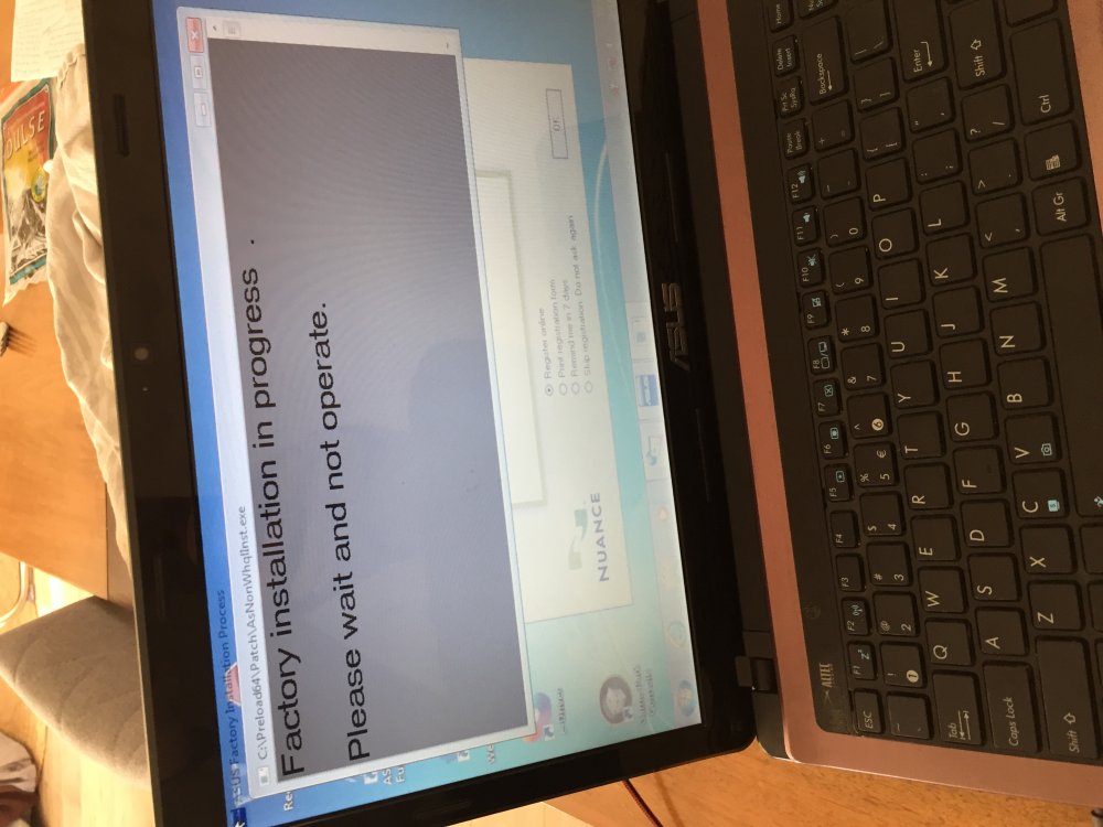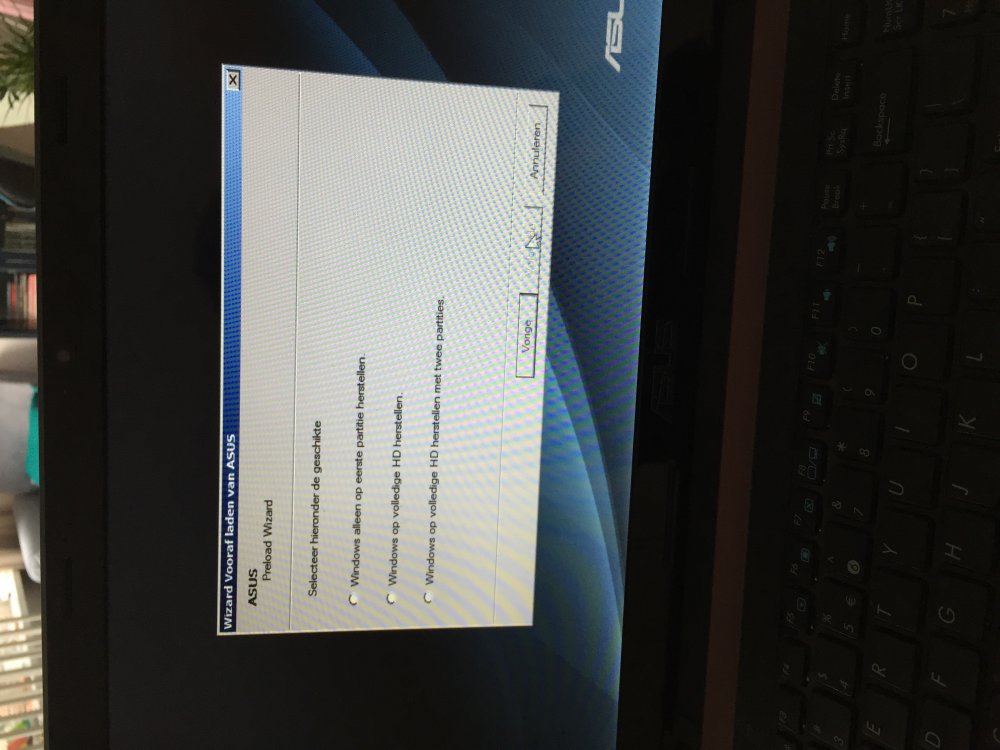 Zo'n gevoel kreeg ik al.. Tijdens het in fabrieksinstellingen zetten heb ik alles gedaan zoals jullie zeiden. Er was 1 ding dat mij opviel. Toen ASUS bezig was om alles in fabrieksinstellingen te zetten, ging die laptop vaak even aan en uit. Toen plots de laptop uitviel, wachtte ik het af of hij uit zichzelf aan ging. Dat deed het niet, toen zette ik 'm zelf aan en toen kreeg ik zwart startscherm waar je kunt aangeven dat je " windows in veilige modus wilt starten", "nog een modus, waar ik de naam niet van weet", en in "normale modus". Ik ben voor normale modus gegaan. Mogelijk was de laptop nog niet helemaal in fabrieksinstellingen en halverwege gestopt? -