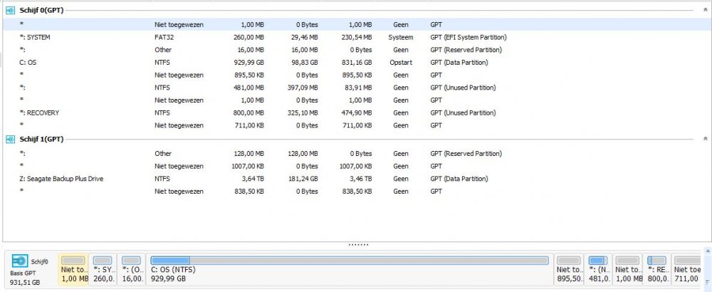 Die aomei back upper werkt wel degelijk goed en zoals uitgelegd... Nu wil ik even toch laten zien via onderstaande foto van wat easus data recovery weergeeft op het einde van de diepe scan, inclusief directorystructuur zoals ze oorspronkelijk was, als ik me niet vergis gebruikt deze de mft van de schijf. via partition manager van easus merk ik op dat die partities nog bestaan maar niet toegewezen zijn zie onderstaande foto... De oorspronkelijke partities die er eerst waren zijn dus door de reset of herinstallatie verborgen ? in ieder geval vind ik geen wegen of entrys mocht bvb de vorige installatie nog de inhoud hebben dat ik aldaar had opgeslagen, zat mij te bedenken dat ik geen indicaties heb van welke partitie ik moet zoeken volgens de easus datarecovery...nochtans is dat allemaal nog op dezelfde fysieke schijf te vinden, alleen ik had er aan moeten denken om voor de zekerheid back ups van te maken, laat staan dat ik wist hoe te doen, als ze mij hiervoor hadden ingelicht dat de mogelijkheid bestaat dat niet alleen mijn toetsenbord zou vervangen worden maar nog nagekeken wordt op het functioneren, een beleid wordt toegepast om te voorkomen dat personen misbruik maken van wat er op jouw computer staat. AOMEI Backupper heeft ook geen indicaties van vorige of niet toegewezen partities...het enigste wat mogelijk nog kan is sector per sector via usb-boot van aomeibackupper, volgens de handleiding heeft dit wat langer tijd nodig en ook weinig zinvol is.... Nu ga ik even opgeven en mij gaan richten op andere mogelijkheden want schijnbaar kan mijn laptop enkel op de vaste interne schijf booten en staat dan ook enkel vast op deze bootmogelijkheid, ben al in de bios geweest van mijn laptop en heb geen bootmogelijkheden, het staat dus effectief geblokkeerd. -