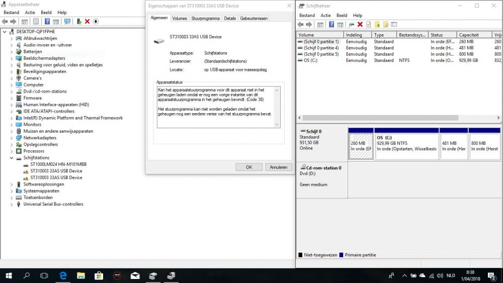 Oeh, neen, of ik ga straks nog een toren van pisa verkrijgen, ben nog aan het bezien of ik niet beter 2x 5 schijven naast elkaar bouw ofwel 1x 10 schijven in een toren, en heb intussen al mijn keuze gemaakt welke schijven ik ga gebruiken... Intussen is een ander probleem opgedoken in verband met de basisschijven (was ook intussen vergeten dat van de 7 poortshub 2.0 er nog 5 van werken, denk dat te vervangen door een hub 3.0) gisteren pikte mijn laptop heel goed de twee schijven op wees er een succesvol stationsletter aan toe op de eerste de y en de tweede de x, bij wijze van test sluit ik ze later terug aan en vanmorgen blijft het zelfde probleem opduiken weet nog niet hoe dat kan ? Dus alvast aan de slag gegaan met het knipprogramma met onderstaande bijlage, er is maar 1 bericht in het midden omdat beide hetzelfde bericht vertoond, in mijn apparaat beheer geeft het een driehoekje met uitroepteken in, aan. Voor de rest was het gisteren geen probleem om die eens aan te sluiten en stationsletter aan toegewezen, nu dit, frustrerend !! -