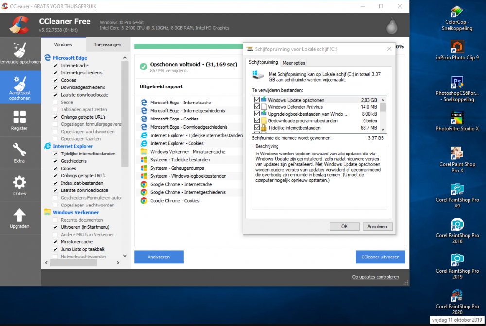 Zoals je kan zien heeft Ccleaner ruim 800MB opgeruimd. Maar start daarna schijfopruiming op kan ik nog ruim 3GB opruimen. Is dan dat de CCleaner zijn werk niet meer doen als het zoveel laar liggen?? Vraag me zo dus wel af of de cleaner nog wel enige nut heeft, of heb ik de dingen verkeerd staan??