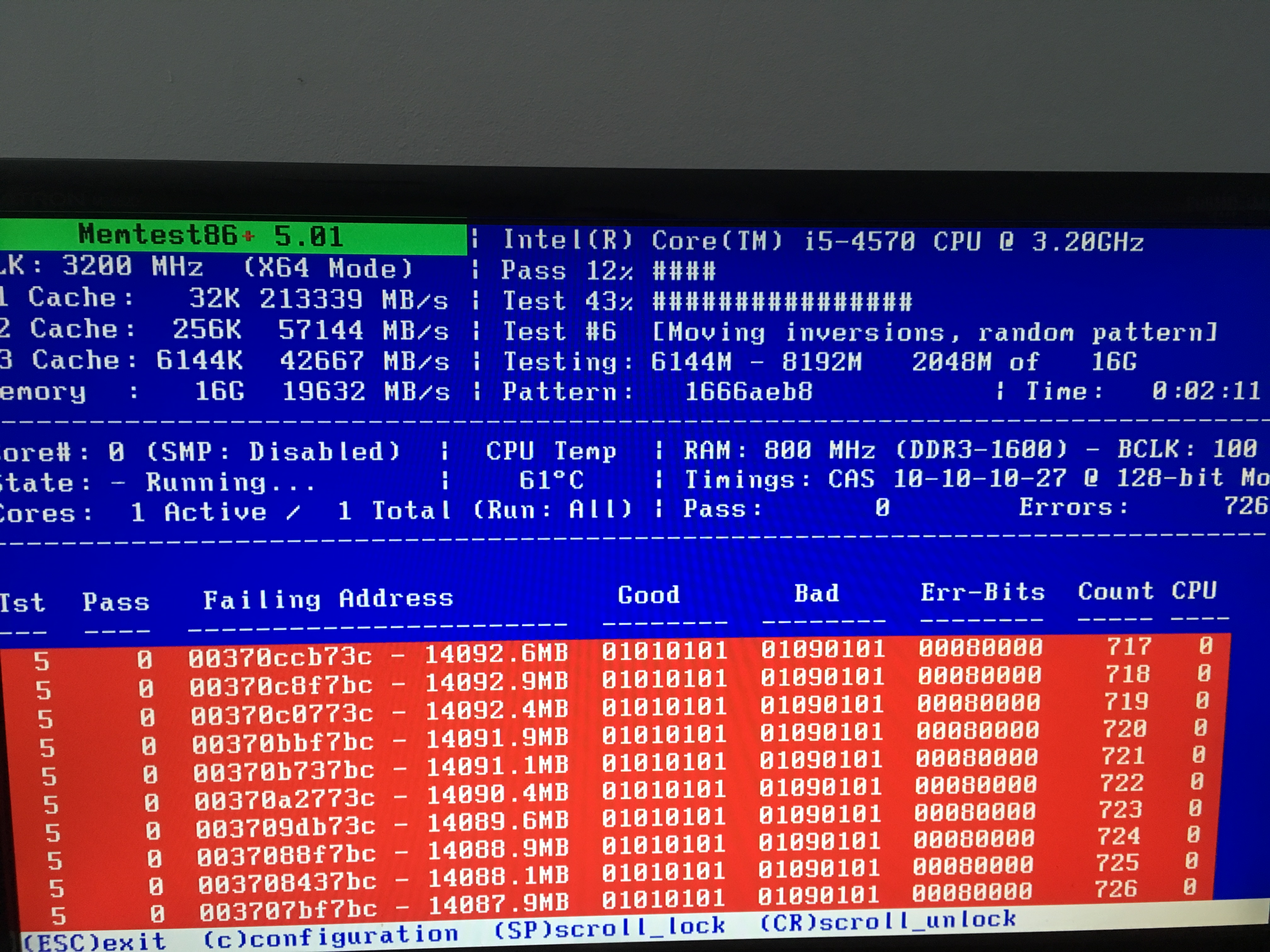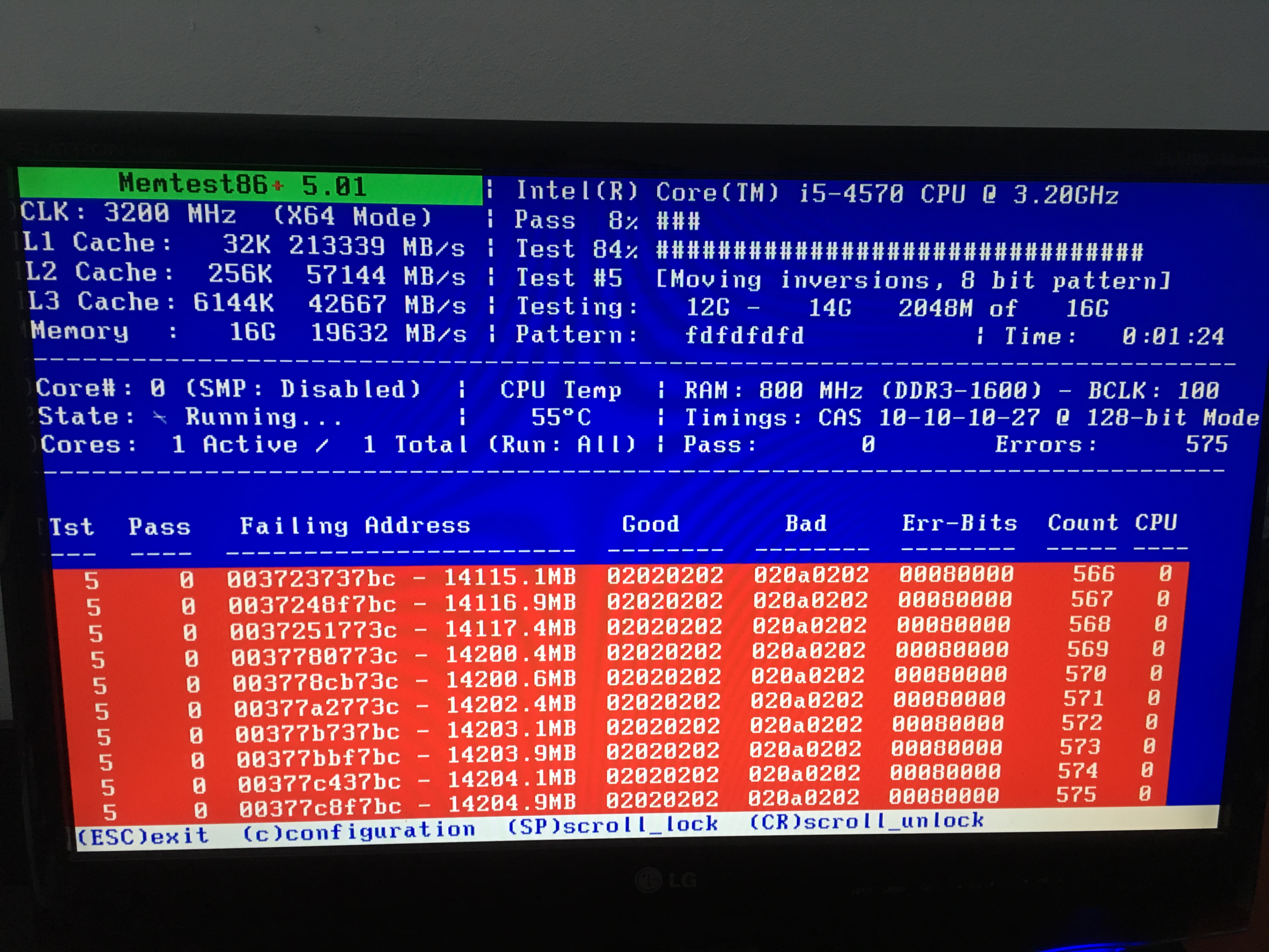 1. Vanaf de start van de Memtest heb ik alleen maar rood in mijn scherm. Wat dus niet goed is. Ik heb 2 fotos even gemaakt
