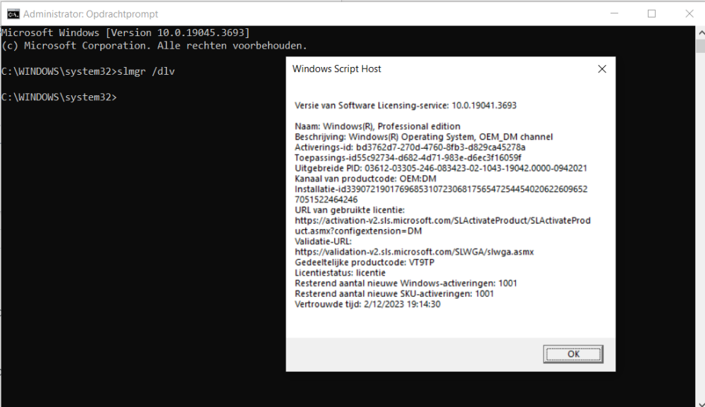 Zonder mij te willen moeien in deze discussie, men kan altijd nagaan of de Windows licentie "echt" is. In cmd (als admin) voer uit : slmgr /xpr. Verrassend is wel het resultaat als de cmd slmgr /dlv uitgevoerd wordt, zie screenshot hierna. Werd uitgevoerd op mijn pc en voor alle zekerheid op 2 andere (pc's van mijn club, recentelijk aangekocht). Resultaten zijn identiek.....