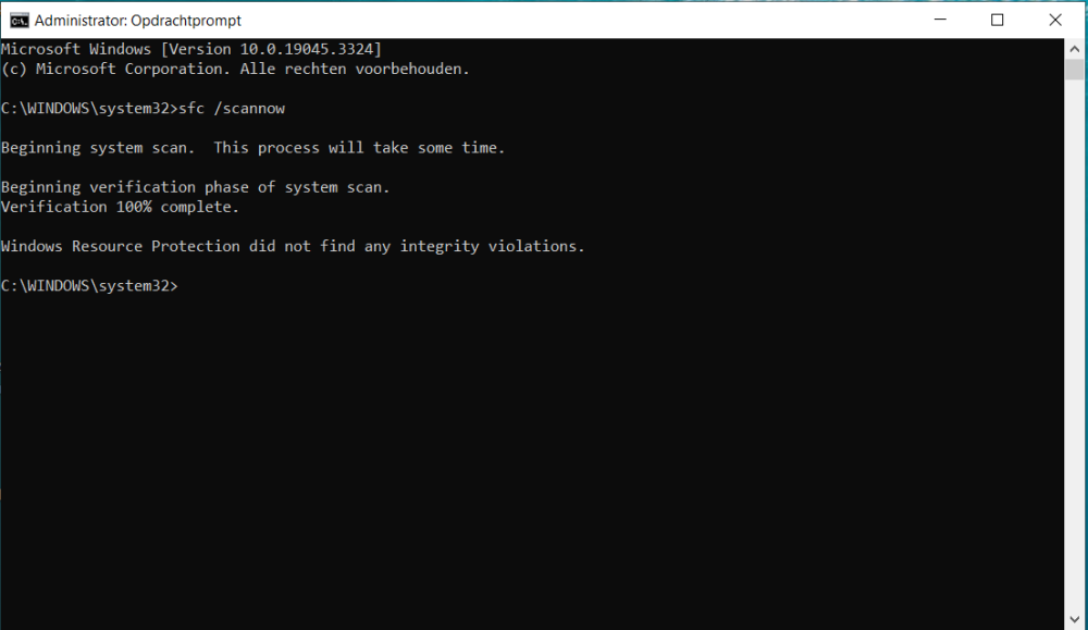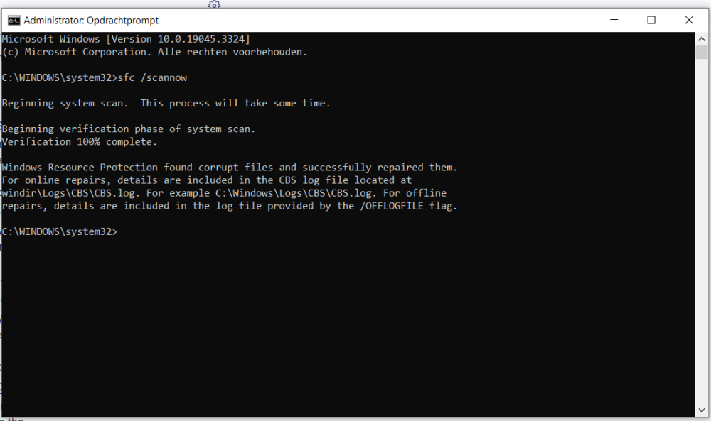 In de zoekbalk, typ : CMD en voer uit als administrator. In het CMD venster dat dan verschijnt, typ : sfc /scannow En voer dit een nadien een 2e maal uit.