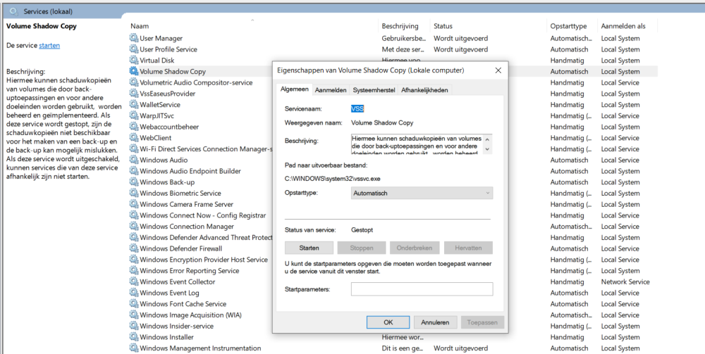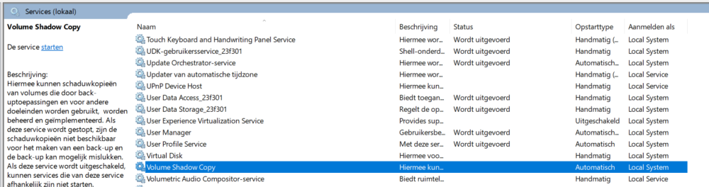 Ja, maar is deze service ook gestart? (Linkerbovenhoek van de afbeelding, "deze service starten"). Het duurt wel even vooraleer de shadow copy gemaakt wordt.