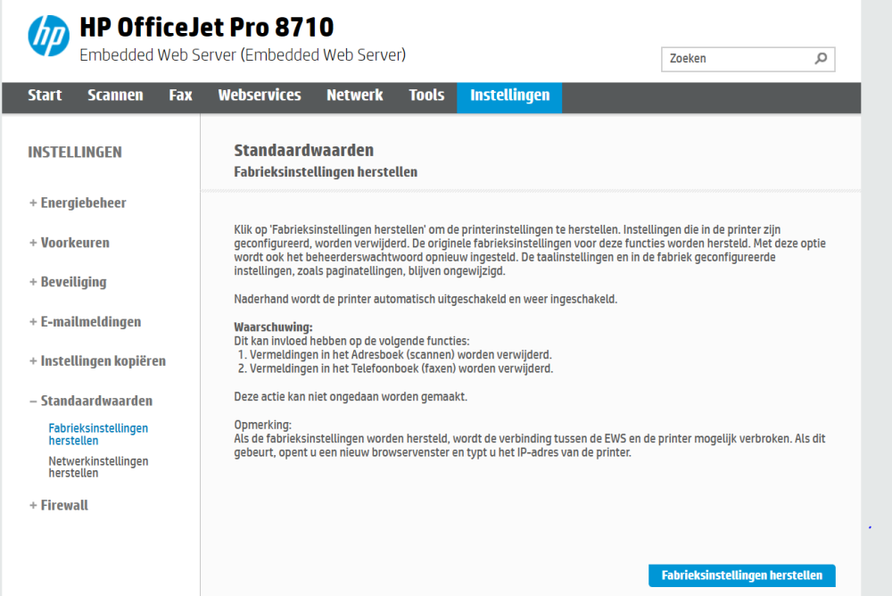 Als je inlogt met het IP adres zou je onmiddellijk het menu van de printer moeten zien? Tools is een van de tabbladen bovenaan. Bij jou noemt dat "Gereedschap".