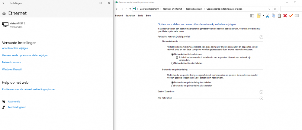Dat is inderdaad goed nieuws. En de oplossing wordt je door Windows aangereikt : Netwerkdetectie inschakelen in Netwerkcentrum. - Instellingen openen. (zoekvak rechts onderaan : instellingen.) - Klik op Netwerk & Internet. - Klik op Ethernet, dan op netwerkcentrum. - Geavanceerde Instellingen voor delen -> - Selecteer onder 'Netwerkprofiel' "Privé" (als dat niet ingeschakeld was) om je computer (en de andere, idem) vindbaar te maken op een netwerk dat je vertrouwt en toestaat, en andere gebruikers om de printer te gebruiken of toegang te krijgen tot bestanden die je mogelijk deelt. Hierna vind je een screenshot van mijn pc en hoe het er zou moeten uitzien. Ik ben nu weg voor een vergadering met goede kameraden. Tot morgen en succes! En mogelijks kan @droske je vandaag nog verder helpen indien nodig. . -