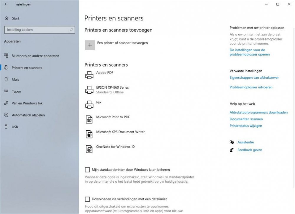 Er lijkt mij toch iets vreemd aan de hand met je netwerk, zo bv. geeft de IP Scanner aan dat je niet kan aanloggen op je eigen pc (geen ">" symbool). In het blad Printers en scanners zie je je printer staan. - Verwijder het vinkje bij "mijn printer door windows laten beheren". - Dubbelklik erop en hij vouwt open, ga naar beheren. Start de probleemoplosser. Wat zegt die? En nog een vraagje : is de printer verbonden met het netwerk via WiFi of met een kabel? -