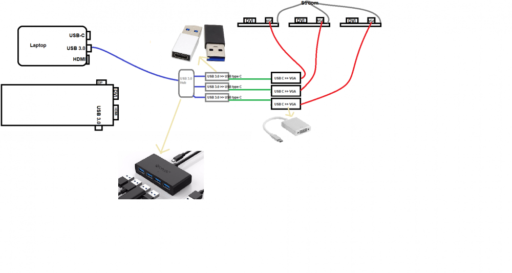 2. Ik heb dus afgelopen week 3 werkende monitoren ontvangen en toen dacht ik, laat ik eens een multiple monitor setup gaan maken met deze monitoren. Want ik zat te kijken en dat ziet er altijd best gaaf uit. Mij lijkt het ook ideaal om zo'n setup te hebben zodat ik met veel dingen tegelijkertijd bezig ben. Dus ik heb gelijk zo'n standaard gekocht voor 3 monitoren en die heb ik zojuist ontvangen. Alleen toen dacht ik, hoe ga ik dit ooit aansluiten op mijn laptop (en eventueel mijn PC). Dus toen ben ik gaan zoeken op aliexpress en kwam daar kwam ik een aantal dingen waarvan ik dacht dat het wel van pas kon zijn. Ik heb hiervan een schema gemaakt die zit in het bestand en ik zal nog even de specs geven van mijn apparaten. Het zou echt helemaal top zijn als iemand even zich hierover uit en dat zou mij echt mega erg helpen. Alvast bedankt, Specs van de apparaten die ik nu bezit: Laptop: Asus R417B - HDMI, USB 3.0 & USB type C ingang (niet voor opladen) PC: (Niet heel relevant, ik zou graag alleen mijn laptop willen aansluiten maar als mn PC er ook op kan is dat natuurlijk top) - GTX 1050 Gainward 2GB met: HDMI, DVI & DisplayPort Monitoren: HP Compaq LA1951G - DVI & VGA ingang - USB B poort voor twee USB 2.0 poorten om bijv. muis en toetsenboord aan te sluiten.
