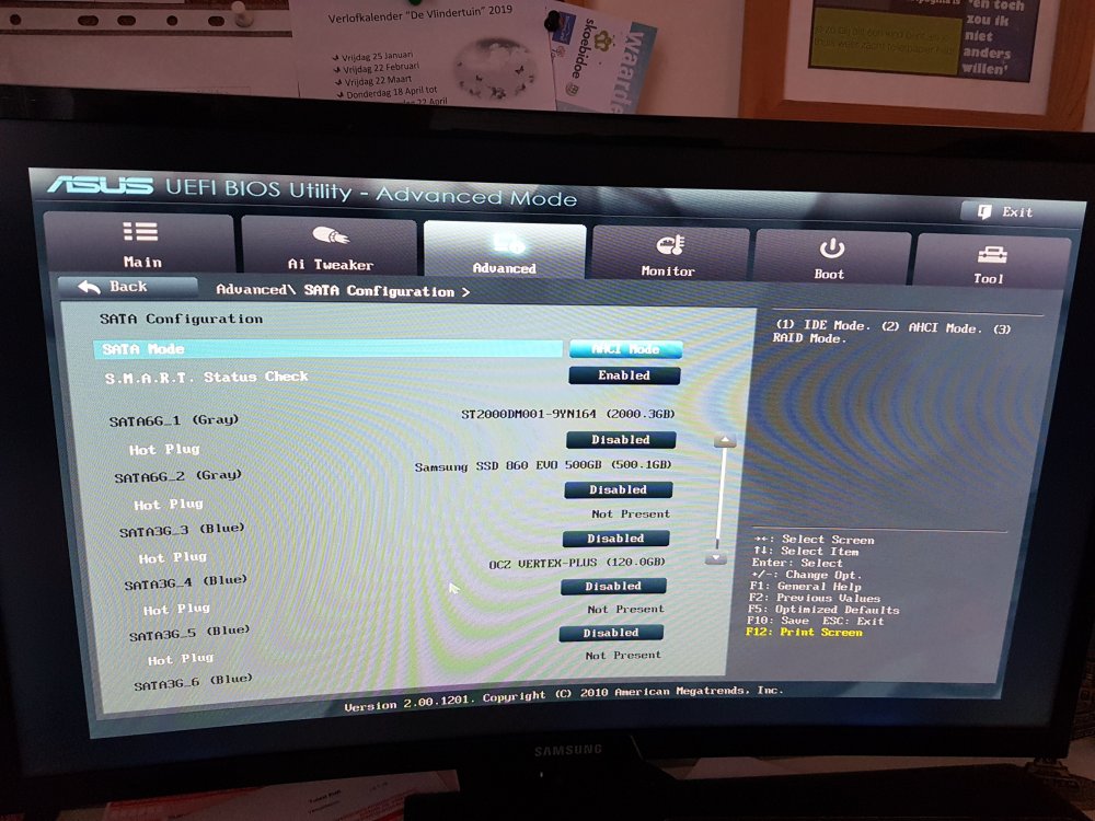 Droske, Eerst en vooral een dankwoordje Ik leer veel bij op dit moment en vind het boeiend. Ik heb gecontroleerd en wit was met wit verbonden. Erna heb ik in de bios gekeken en ik denk dat alles goed stond zoals je zei. Behalve de oude ssd omdat ik die op de CDROM aansluiting heb gestoken. Had geen witte aansluitingen meer. Het resetten van de bootmanager weet ik niet hoe te doen. -