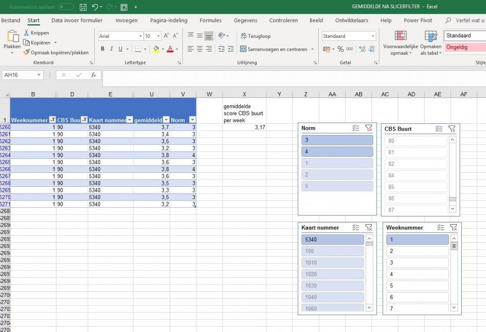 1. Goedemorgen, Ik zit met een moeilijke opgave L In het bestand (zie bijlage) staan de gemiddelde scores kolom U2:U52687 Als ik via de slicers 1 CBS buurt en 1 weeknummer selecteer, dan zou ik van de resultaten het gemiddelde willen weten van de waarden in kolom U. Ik heb de bekende formule voor GEMIDDELDE direct onder het kopje “gemiddelde score CBS buurt per week “ gezet NA DE SELECTIE , maar als ik een nieuwe selectie maak, dan is die formule foetsie. Hoe krijg ik het voor elkaar om een blijvende formule zichtbaar te krijgen na elke willekeurige selectie van CBS buurt met weeknummer? Ik hoop dat u mij zou kunnen helpen met een oplossing Bij voorbaat dank voor uw aandacht voor dit probleem. Met vriendelijke groet, W.E. Haeser Mobiel 06-53413802 GEMIDDELDE NA SLICERFILTER.xlsx