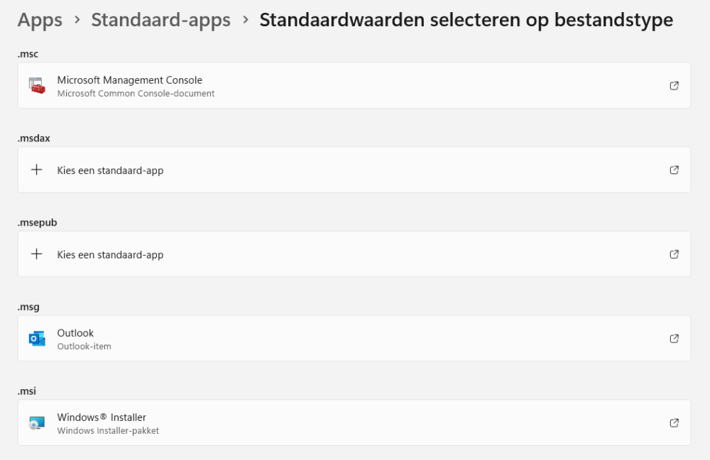Dag porrelaar, Ik vind onder "Verwante instellingen" - en "Standaardwaarden selecteren op bestandstype" - vind ik .msg zoals hieronder in bijlage: U ziet, ik vind direct Outlook, en ik heb deze aangekruist als "standaardlocatie" Hopelijk deed ik goed !! Nu zouden de bestanden met .msg automatisch moeten openen bij een dubbel klik, doch dat is niet het geval, sommige plaatsen doet hij het, en bij andere plaatsen gaat het niet. BIZAR. Het wordt niet gemakkelijker, misschien ons houden bij ZAMAR - gezien het om enkele bestanden gaat. Bij uw goedkeuren, kunnen we deze topic dan ook sluiten. Nog eens bedankt voor uw moeite en mijn beste groeten. Roland. -