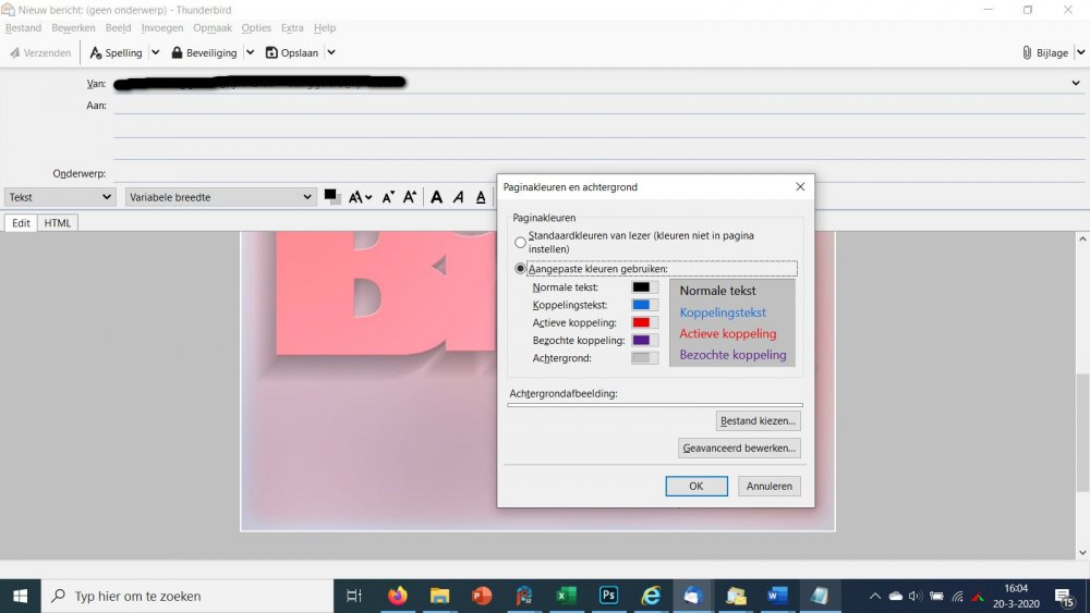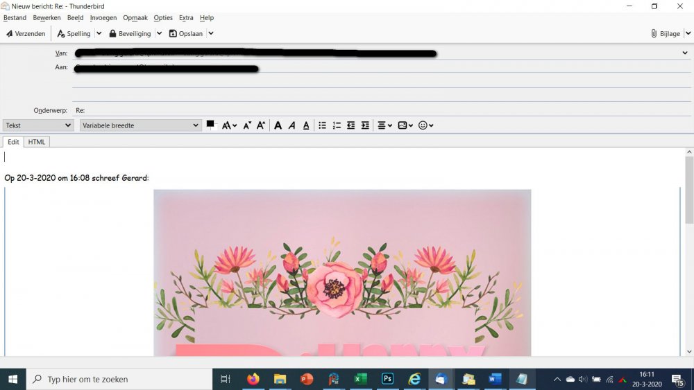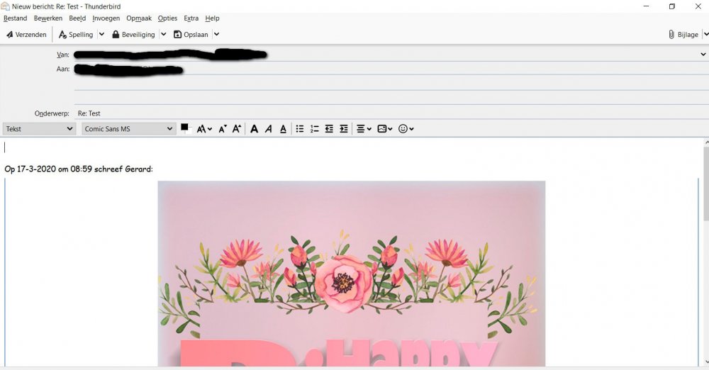 20. Ik werk met Windows 10. en werk met het Email programma Mozilla Thunderbird. Ik doe in de mail meestal een achtergrond (afbeelding) dat werkt prima, Als degene die de mail krijgt en de mail wil beantwoorden, komt er in de mail geen achtergrond mee. Ik heb geprobeerd een mail met achtergrond naar mezelf gestuurd, en die met beantwoorden terug te sturen, dan is ook de achtergrond verdwenen . Ik werkte altijd met Incredemail, maar die houden er mee op 20 Maart , en daar werkte de mail normaal., bij beantwoorden Ik doe er een paar printscreens bij om te laten zien wat ik bedoel. Grt Gerard