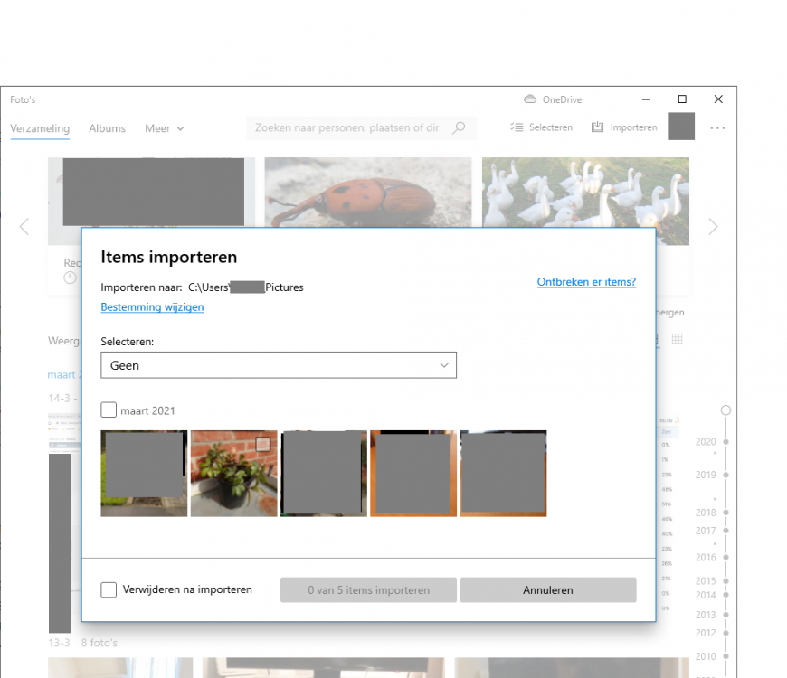Snap ik. Maar dat gebeurt niet altijd. Soms moet ik de camera eerst inschakelen (weer geluid). En ik klik absoluut met de RECHTERMUIS! Uiteindelijk krijg ik meestal onderstaand beeld. Maar daar kan ik alleen selecteren welke foto's. Vreemd allemaal. Anders ga ik maar knippen en plakken. Die automatisch aangemaakte mappen waren juist zo fijn......