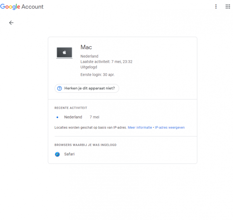 In mijn "Google Account-Beveiliging-Je apparaten-Apparaten beheren" zie ik een Mac pc staan. Ik heb geen Mac pc, nooit gehad en ook nooit bij iemand met een Mac ingelogd. Ik heb de aanbevolen stappen gevolgd, ben nu uitgelogd en heb mijn Google wachtwoord gewijzigd. Toch zie ik het apparaat nog steeds. Kan ik dat apparaat niet verwijderen?
