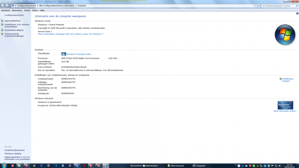 dat kan je zien in het configuratiescherm altijd ga naar configuratiescherm in startmenu en vervolgens gaat u naar computereigenschappen dat kan u ook vinden door in startmenu op computer rechter muisknop te drukken en naar computereigenschappen gaan en dan ziet u het overzicht met alle gegevens: kan u me dat even printscreen doen en opsturen via deze post?