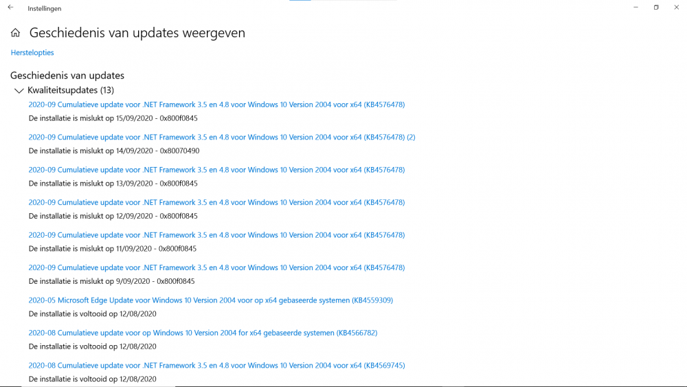 De mislukte updates hebben volgende error codes : 0x800f0845 0x80070490